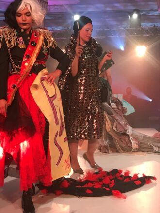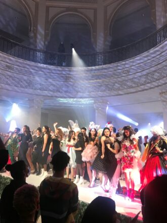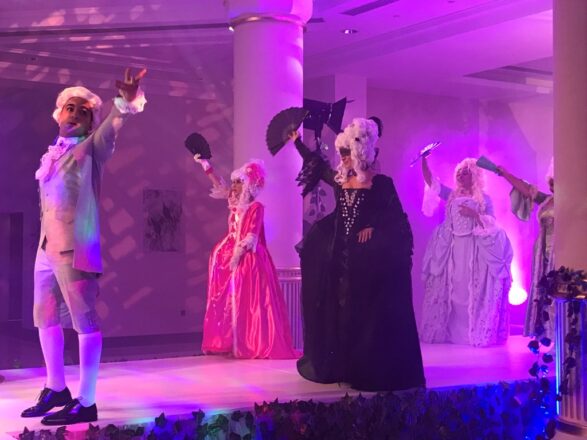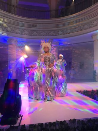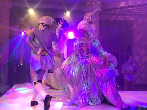 Публика очень тепло приветствовала каждый выход на подиум, и это было вполне заслуженно. Не только потому, что большинство зрителей составляли родственники и друзья моделей, но и благодаря пышной костюмной постановке. Чувствовалось, что модели смогли вжиться в сложные одеяния прошедших эпох, в эти рюшки, пижмы, корсеты, подвязки, взбитые парики, а парни адаптировались к узким мужским кафтанам и лосинам.