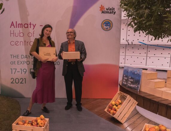 В рамках дней города Алматы на EXPO прошла конференция по туристическому потенциалу города с приглашением зарубежных компаний, государственных структур и арабских СМИ. Внутри павильона Казахстана делегатов встречала экспозиция из яблок. Яблоко – исторический символ Алматы, так как название города происходит от казахского слова «алма», означающее «яблоко».