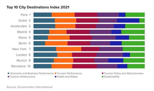 Париж занял первое место и получил высокую оценку за высокие показатели в области туризма, особенно среди посетителей из Азии и США. В рейтинге, города оцениваются по результатам их деятельности в 2021 году по целому ряду секторов, включая показатели экономики и бизнеса, эффективность туризма, политику и привлекательность туризма, инфраструктуру туризма, здоровье, безопасность и устойчивость.