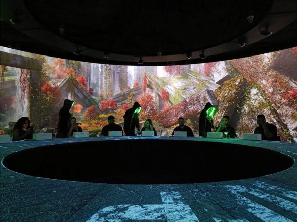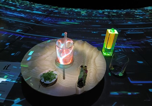 Мы попадаем в «гастротеатр» на 20 мест, специально спроектированный в форме круга, чтобы проецируемые изображения не обрезались по углам, как в стандартном прямоугольном помещении. Именно здесь мы станем свидетелями (и участниками) того, как экзотические блюда сочетаются с фантастическими технологиями.