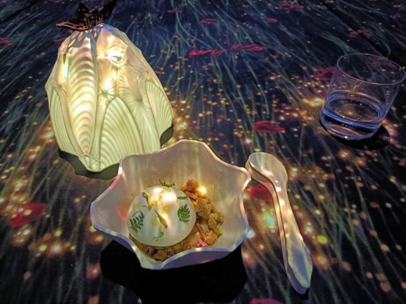 В основном зале столь понятная нам приятная реальность уходит на второй план. Каждая поверхность, включая огромный стол в центре, служит проектором. В один момент вы погружаетесь в психоделическую игру огней на столе, а в следующий – волшебные карпы кои плавают прямо под вашей тарелкой, пульсируя в такт энергичной музыке. Это странно, восхитительно, сводяще с ума и совершенно гениально.