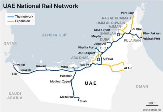 На днях железнодорожный перевозчик ОАЭ – Etihad Rail – объявил, что пассажирские перевозки начнутся в 2026 году, а первые четыре станции будущей сети, которая в конечном итоге охватит всю страну, будут расположены в Абу-Даби, Дубае, Шардже и Фуджейре. Etihad Rail будет стремиться привлечь граждан и жителей страны, предоставив вагоны, способные перевозить по 400 пассажиров, и поезда, которые будут развивать скорость до 200 км/ч.