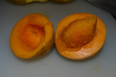 С косточки срезаются обе плоские стороны плода, а затем мякоть рассекается кубиками. Получается вот такая живописная картина: